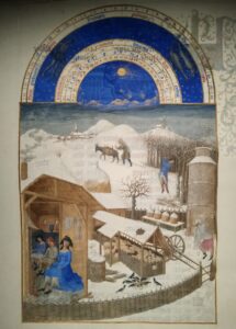 Mijn favoriete plaat is die van februari, waarop mensen zich warmen bij een vuurtje, zonder decorum al te zeer in acht te nemen. Op veel van de afbeeldingen is één van de kastelen van de graaf te zien; als je goed kijkt kan je hier op de achtergrond inderdaad een kasteel zien.