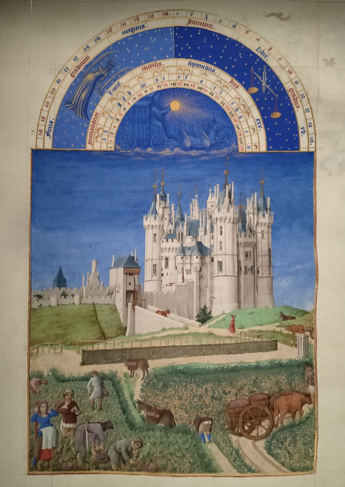 Vandaar dat het zo druk was toen ik op zaterdag 27 september 2025 in het Château de Chantilly was. Ik kwam niet voor de indrukwekkende gronden, noch voor de paardenshows. Nee, net als de meeste mensen was ik speciaal voor het middeleeuwse boek afgereisd naar dit gat ten noorden van Parijs. Aan de in de rij gesproken talen te horen (Frans, Nederlands, Engels met een Brits accent, Duits, Engels met een Amerikaans accent…) was men van heinde en verre gekomen. Niet vreemd, aangezien het wereldberoemde boek normaal gesproken niet op deze manier tentoongesteld wordt. Vanwege restauratiewerkzaamheden is het uit elkaar gehaald, waardoor – misschien wel voor de laatste keer ooit – de zesentwintig bekendste bladzijden, namelijk de kalender, afzonderlijk te bewonderen zijn.